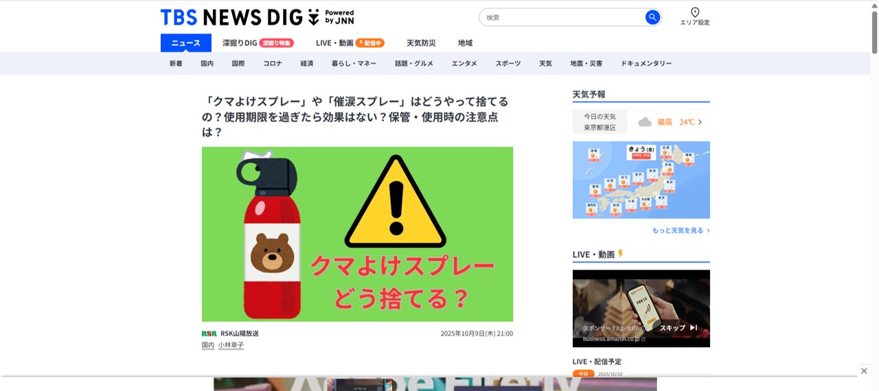 不審者対策として『催涙スプレー』を備えていた小学校で、期限切れのスプレーを廃棄する際の誤った取り扱いにより、119番通報があったとの報道がありました。催涙スプレーや熊撃退スプレーは、特に刺激性が強いため、廃棄の際には十分な注意が必要です。私たちの身の回りにあるスプレー(エアゾール製品)も同様に、使用や廃棄の際には共通して注意すべき点があります。番組では、家庭での廃棄手順や注意点について、実際のスプレー缶を使って実演しながら解説しました。