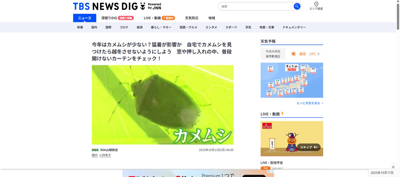 【ティッシュで掴むべからず】この秋大量発生の“カメムシ”は「臭いも一級品」効果的に追い払う方法は?と題したコーナーで、今年大量発生したツヤアオカメムシの紹介と、なるべくにおいを出させずに追い払う方法を紹介しました。もし、カメムシを見かけたら、ティッシュや粘着テープで乱暴に扱うとにおいを発するので(つぶすのが最悪です)、紙やペットボトルなどにそっと追い込み、外に逃がしてあげましょう。