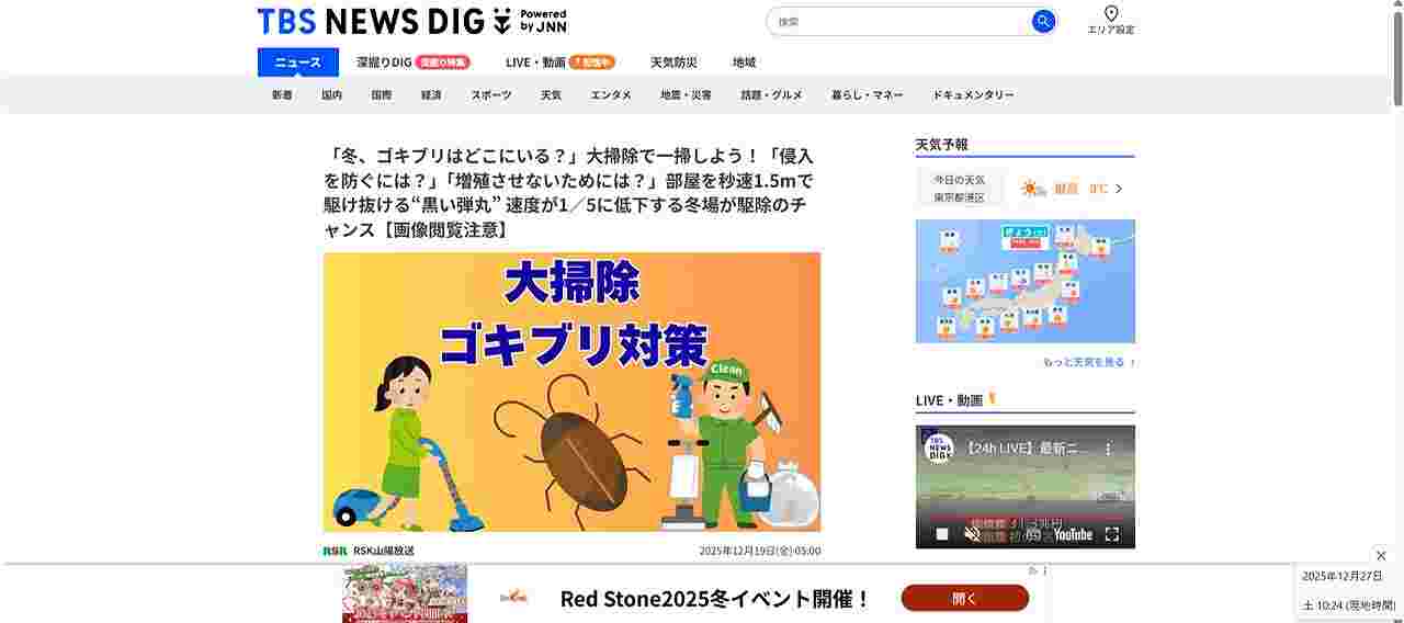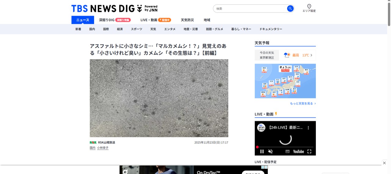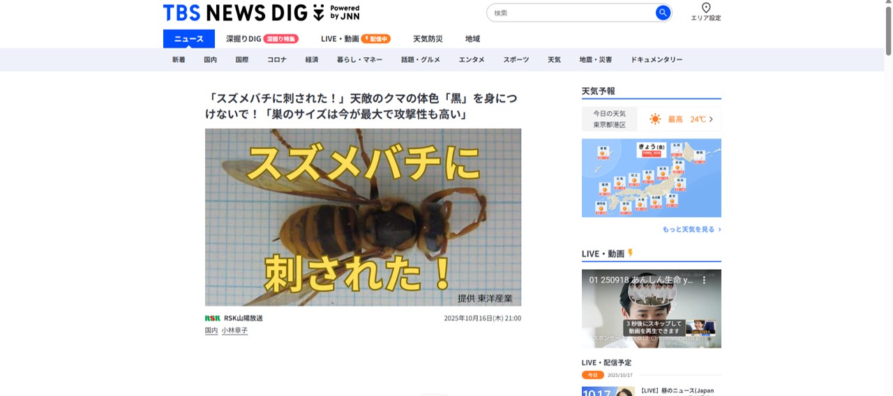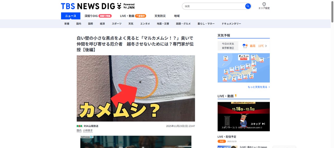 「無視できない虫のはなし」で10分の小コーナー(AM 7:15~7:25)に出演しました。冬の虫の過ごし方、今年は少なめ?カメムシを見つけてしまったらどうやって捕まえる?カメムシキャッチャーのご紹介、スズメバチの一生とこれからの時期のスズメバチ対策、ゴキブリは今どこにいる?、冬にも問題になる害虫対策といった話題を生態を交えながら簡単な対策のご説明をいたしました。冬は虫は少なくなるように見えますが、この時期にやっておくと春以降安心になる対策もあります。